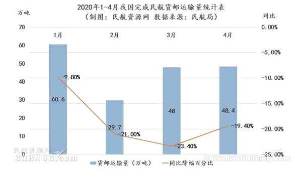 图:2020年1-4月我国完成货邮运输量统计表。制图:民航资源网 数据来源:民航局