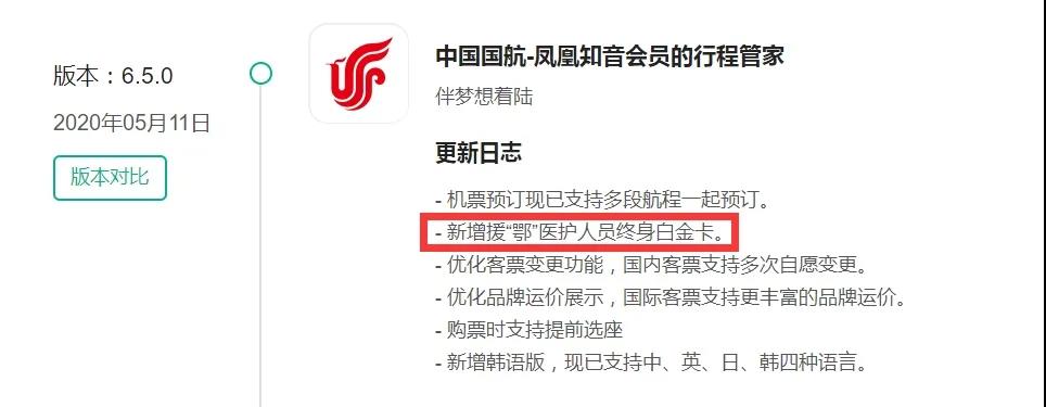 5月11日,护士节来临前夕,国航上线最新版app,新增包括援“鄂”医护人员终身白金卡等多项功能。更新日志如下: