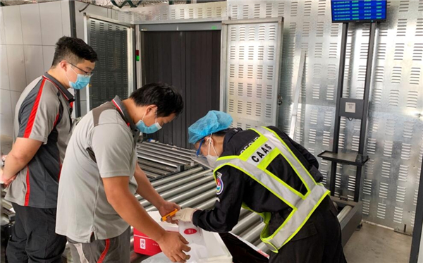 图:货物代理人员将已申报货物放入扫码机进行货物信息采集,随后货物进入安检机。首都机场集团公司供图