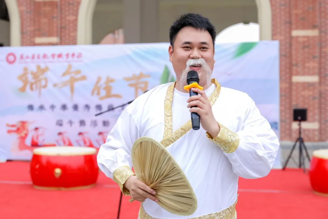 活动伊始,团委书记张伦畅所扮演的苏东坡粉墨登场,热情洋溢地主持这一端午活动。“苏东坡”登场后便向现场的师生们介绍了端午节这一具有迎祥纳福、辟邪除灾美好愿望的民俗节日的由来,也阐明这一节日一直以来都是中华传统文化的重要组成部分。