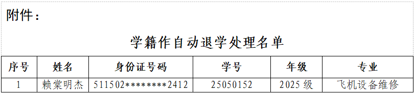 根据《中等职业学校学生学籍管理办法》(职成教〔2010〕7号)及《眉山天航科技职业学校学籍管理办法》(天航科技〔2025〕24号)等相关文件精神,经学生处审核上报,教务处审查,学校校委会研究决定,对赖棠明杰作自动退学处理,现予以公示。
